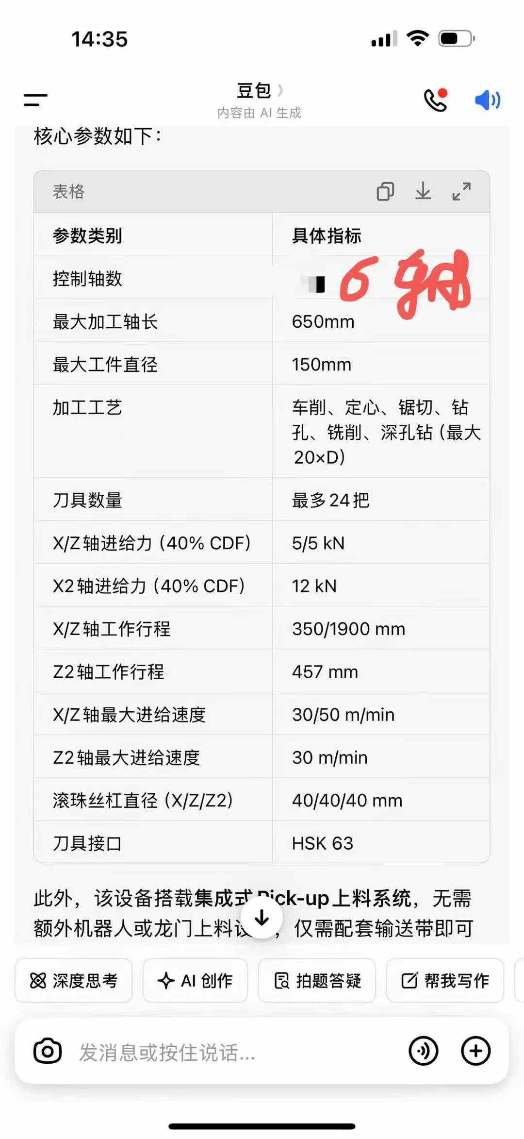 数控系统:西门子 加工范围: 最大加工轴长:650 mm 最大工件直径:150 mm 刀具系统 刀具数量:最多 24 把 刀具接口:HSK 63 轴向进给力(40% CDF) X 轴:5 kN Z 轴:5 kN X2 轴:12 kN 轴行程 X 轴工作行程:350 mm Z 轴工作行程:1900 mm Z2 轴工作行程:457 mm 轴最大进给速度 X 轴:30 m/min Z 轴:50 m/min Z2 轴:30 m/min 丝杠规格 滚珠丝杠直径(X/Z/Z2):40 / 40 / 40 mm