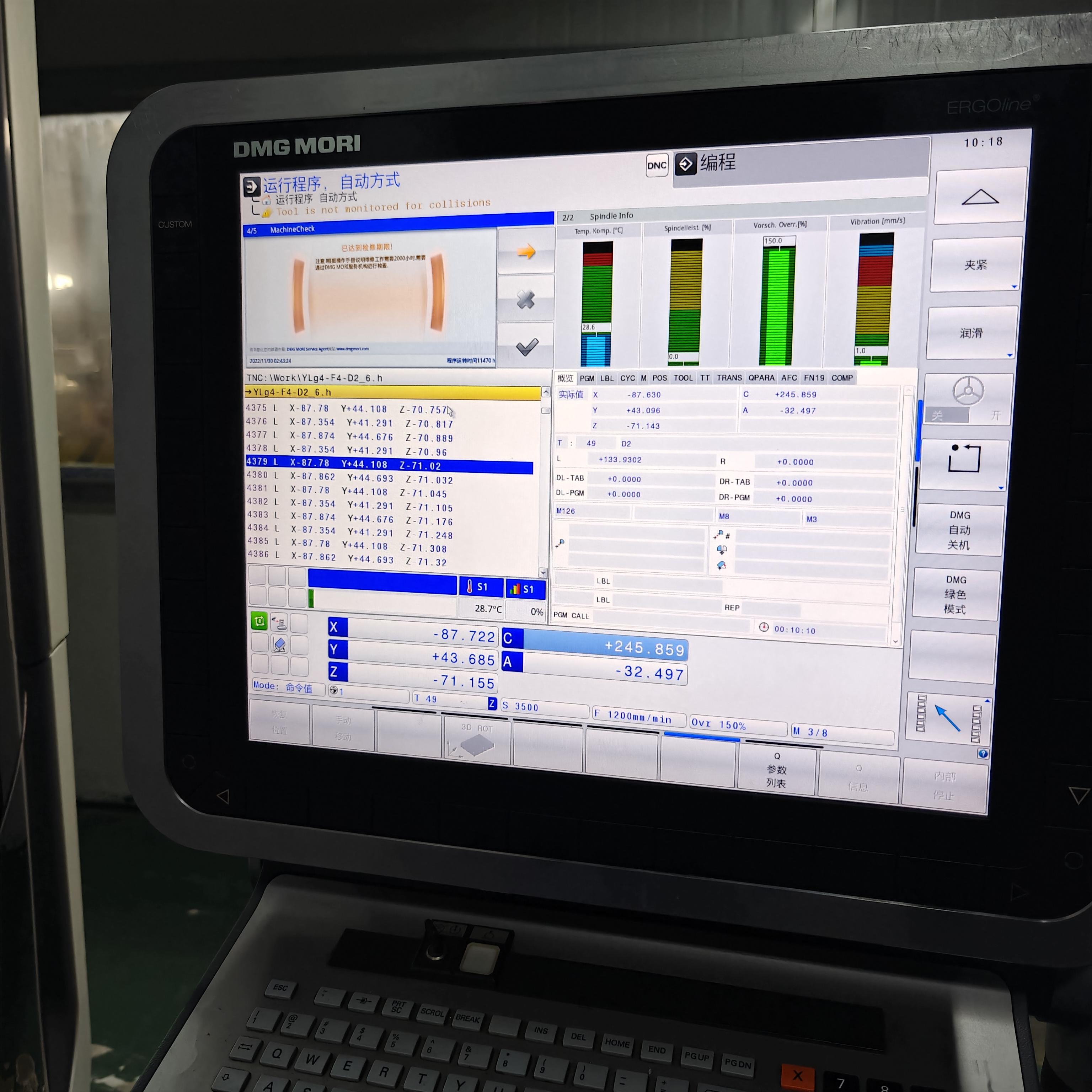 数控系统:海德汉三轴行程:935×850×650 mmA轴:-120°~+120°A轴分度精度:0.001C轴:360°(连续旋转)C轴分度精度:0.001最大加工直径:1040 mm最大加工高度:590 mm回转摆动工作台:工作台尺寸:850×750 mm工作台载重:1500 KG刚性工作台:工作台尺寸:1000×750 mm工作台载重:2000 KG刀库容量:30,ATC主轴:HSKA-100主轴转速:10000 转配置:配40公斤中心出水