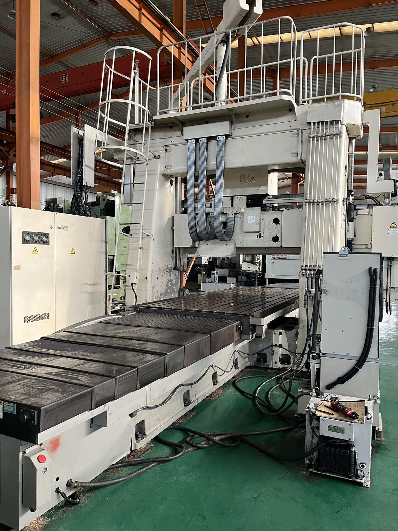 数控系统:OSP -7000M工作台尺寸:1500*3800mm龙门宽:2050mm三轴行程:4000*2000*450mm横梁移动量:1150mm主轴转速:6000转主轴电机:18.5KW主轴:BT50 刀库容量:24,ATC