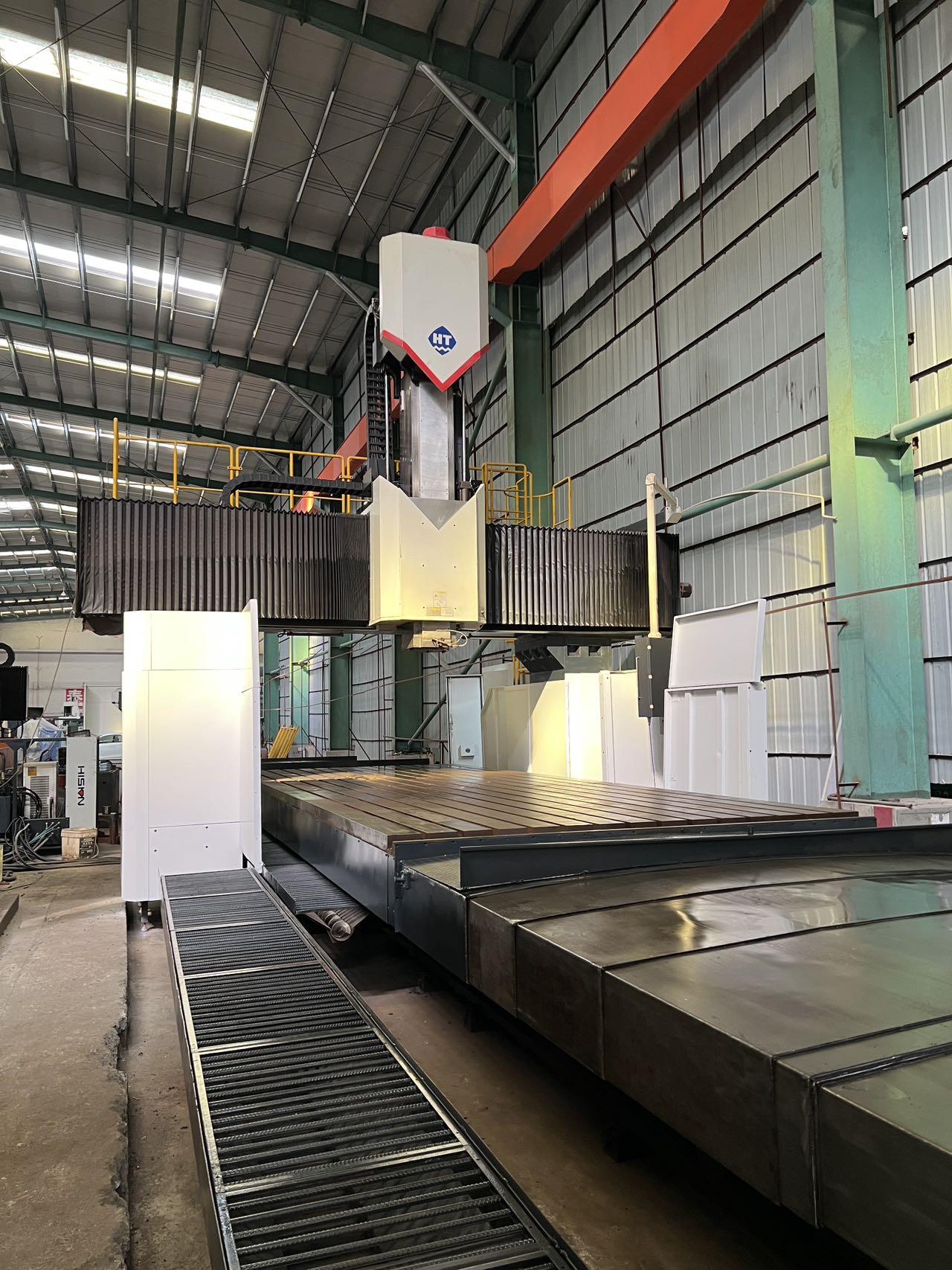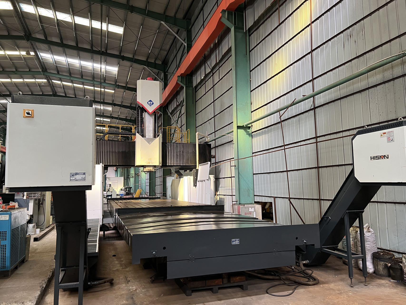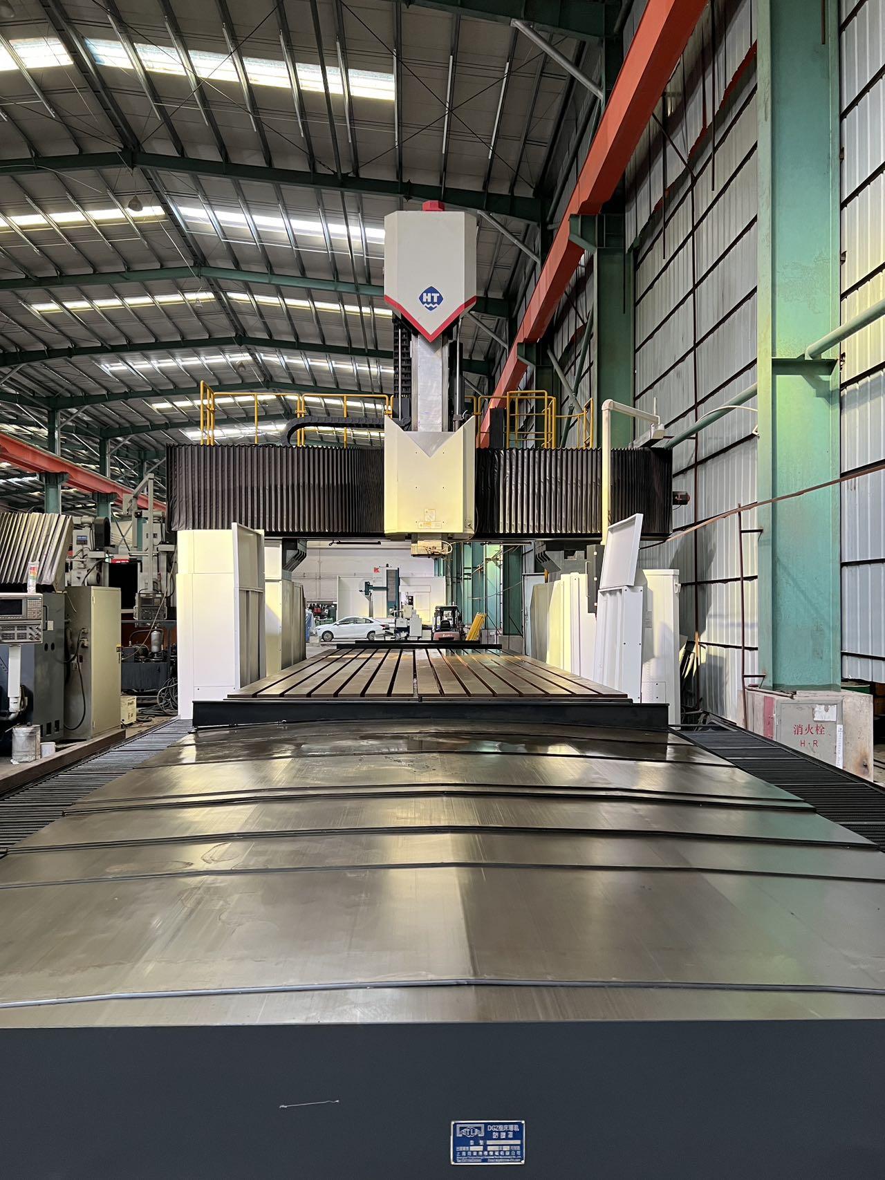 数控系统:发那科MF工作台尺寸:3000 * 8000 mm龙门宽:3650 mm龙门高:3650 mm三轴行程:8400 * 4300 * 1250 mm方滑枕是:450 * 450 mm配置:一个全自动直角铣头双龙头排屑机