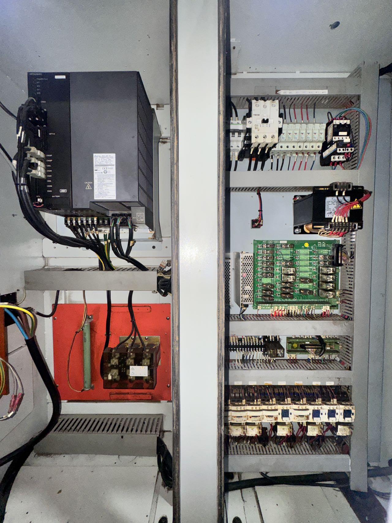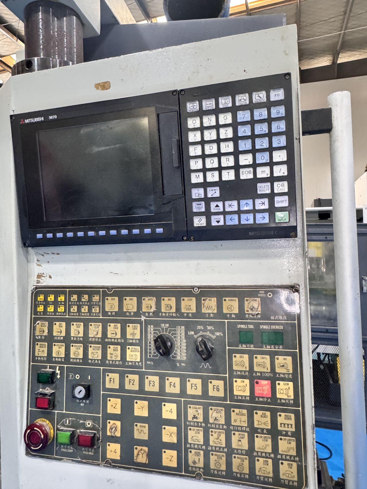 数控系统: 三菱 M70三轴行程:800 × 500 × 500 mm三轴快速移动:36 m/min主轴规格:BT40主轴转速:10000 rpm主轴电机功率:11 kW刀库容量:24,刀臂式工作台尺寸:900 × 500 mm工作台至主轴端面距离:700 mm导轨:三轴日本 THK 线轨,35 规格滚珠导轨精度:主轴轴芯跳动:0.01 mm主轴芯棒正母线:0.01 mm主轴芯棒侧母线:0.01 mm三轴重复定位精度:0.005 mm