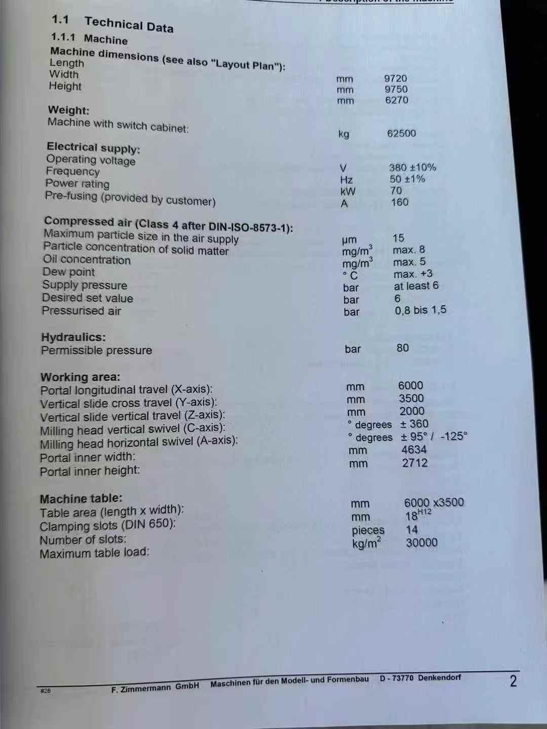 数控系统:西门子 840D三轴行程:6000 × 3500 × 2000 mm工作台尺寸:3500 × 6000 mm龙门宽度:4500 mm龙门高度:2300 mm主轴最高转速:18000 rpm主轴功率:20 kW最大扭矩:64 N·m刀柄类型:HSK63A轴回转范围:-95° ~ +125°C轴回转范围:360°