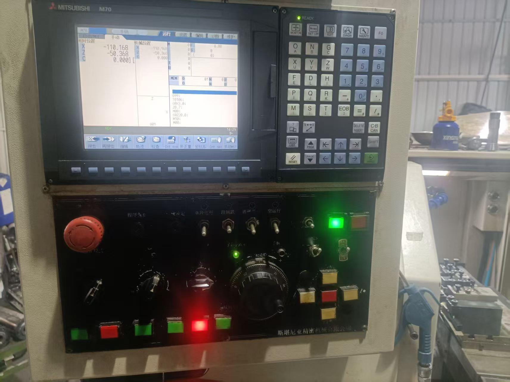最大回转直径:240mm刀板底座上回转直径:120mm最大车削直径:100mm最大加工长度:100mm 主轴转速:7000 rpm主轴通孔直径:φ20mm弹簧夹头柄径:φ26mm X轴行程:230mmZ轴行程:160mm数控系统:三菱M70