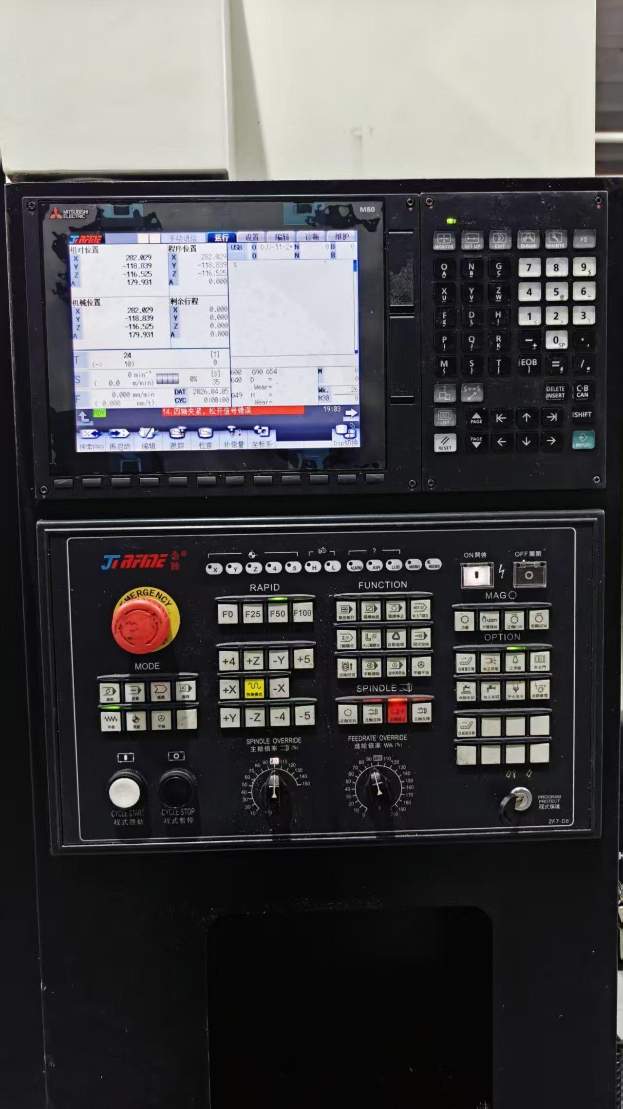 数控系统:三菱M80工作台尺寸:1000x500 mm三轴行程:820x550x550 mm主轴转速:12000 rpm主轴锥度:BT40刀库:24把主轴鼻端到工作台:880mm配置:圆盘尾座;底板;L板;液压站。