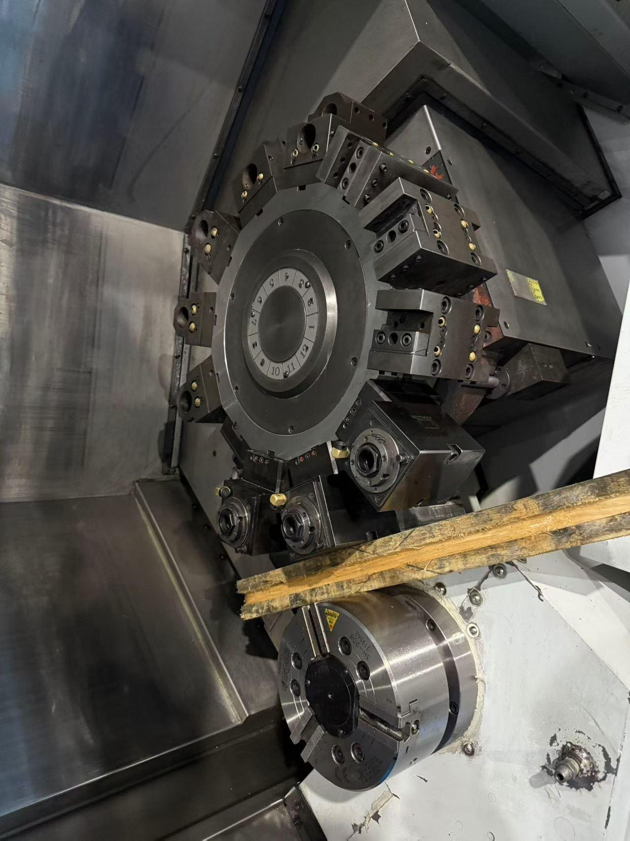 数控系统:发那科0i-TF Plus三轴行程:555 * 200 * 760 mm最大旋转直径:760mm最大车铣直径:440mm最大车铣长度:720mm快移速度:24m/min试机精度:0.01mm正主轴参数:卡盘规格:10 英寸卡盘传动方式:皮带传动主轴电机功率:18.5 kW最高主轴转速:4500 rpm主轴通孔直径:76 mm副主轴参数:卡盘规格:8 英寸卡盘传动方式:皮带传动主轴电机功率:11 kW最高主轴转速:4500 rpm主轴通孔直径:52 mm副主轴B轴前移行程:750mm