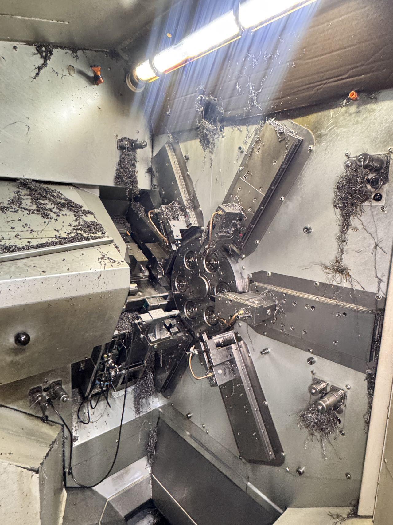 棒料通径:4–14 mm 最大加工长度:40 mm 最大残料长度:70 mm 主轴: 主轴最高转速:8,000 rpm 主轴功率:5.6 kW 主轴扭矩:7.5 Nm 副主轴: 最高转速:8,000 rpm 功率:5 kW 扭矩:6 Nm 轴配置: 直线轴:14 + 1(Y轴,Black Edition) 旋转轴:7 + 1(选配) 切削滑台:5 + 1 背面加:工滑台:1 主轴 Z 轴行程:50 mm 副主轴 Z 轴行程:150 mm 切削滑台 X 轴行程:40 mm 切削滑台 Y 轴行程:30 mm 背面加工 X 轴行程:75 mm 刀具: 最大刀位数:18 背面加工刀位:2 冷却与油路 主轴冷却:油冷 切削液过滤精度:50 μm 油箱容量:900 L 泵系统: 标准泵:4 bar / 150 L/min 高压泵(选配): 35 bar / 40 L/min 80 bar / 26 L/min 其他: 整机重量:7,000 kg 总功率:59 kW