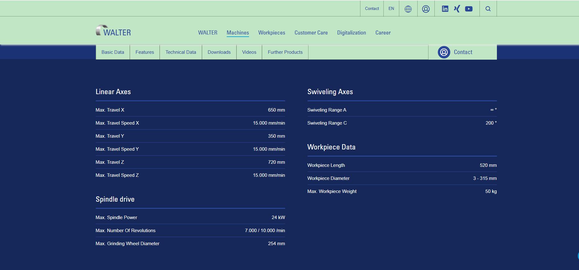 线性轴X轴最大行程: 650 mmX轴最大速度: 15,000 mm/minY轴最大行程: 350 mmY轴最大速度: 15,000 mm/minZ轴最大行程: 720 mmZ轴最大速度: 15,000 mm/min主轴驱动最大主轴功率: 24 kW最大转速: 7,000 / 10,000 rpm最大砂轮直径: 254 mm旋转轴旋转范围 A: ∞ °旋转范围 C: 200 °工件数据工件长度: 520 mm工件直径: 3 - 315 mm最大工件重量: 50 kg