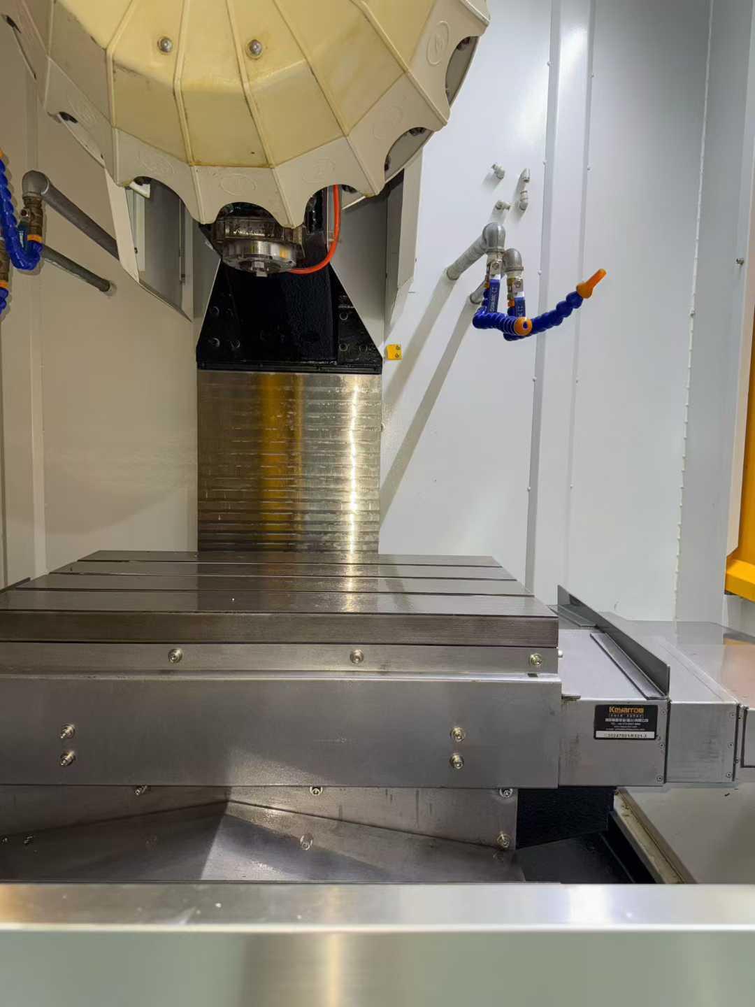 工作台尺寸:650*400mm工作台承重:300kg三轴行程:500*400*330mm主轴转速:20000rpm主轴鼻端至工作台距离:160-460mm主轴中心至立柱导轨面距离:480mm主电机功率:7.5-5.5kw外形尺寸:1785*2320*2540mm刀库:21