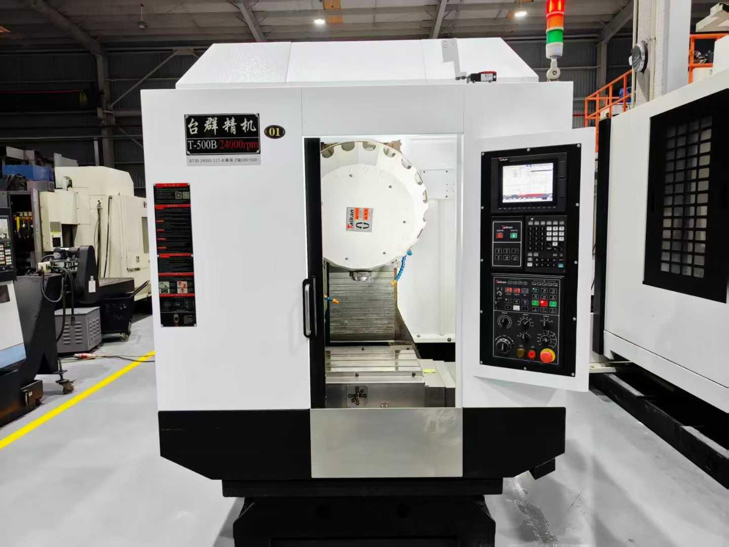 三轴行程:500*400*320mm主轴鼻端到工作台面距离:160-480mm立柱中心支立柱导轨面距离:445mm工作台尺寸:620*400mm工作台承重:250kgT型槽:3*14*120mm电机功率:2.2/3.7kw电机扭矩:7/17.7Nm主轴转速:24000rpm主轴直径:100mm主轴锥度:BT30切削进给速度:1-30000mm/min三轴快移速度:48m/min定位精度:0.006mm重复定位精度:0.004mm刀库容量:21刀具最大长度:200mm刀具最大直径:60/80mm外形尺寸:1600*2600*2300mm机器重量:3100kg