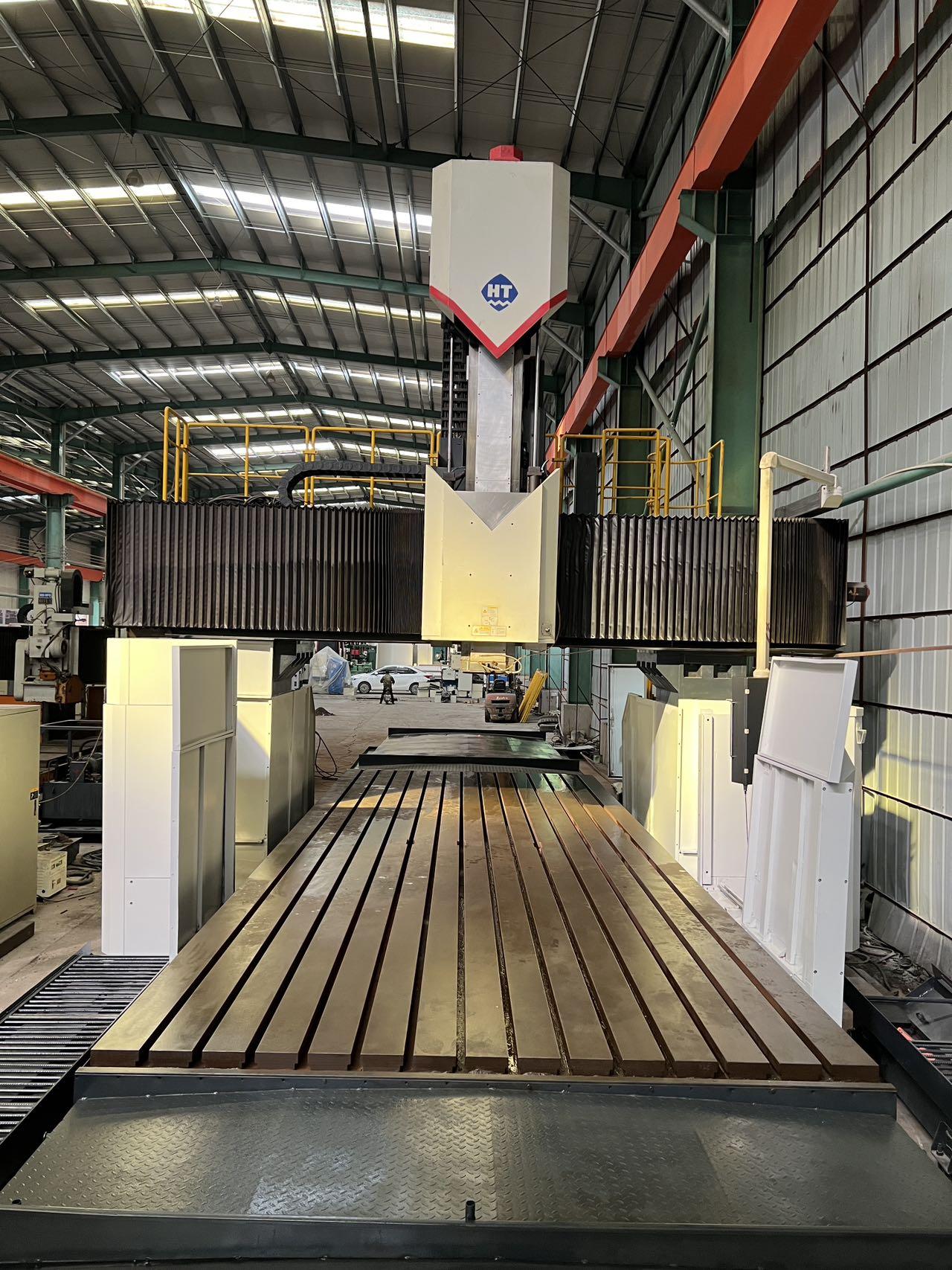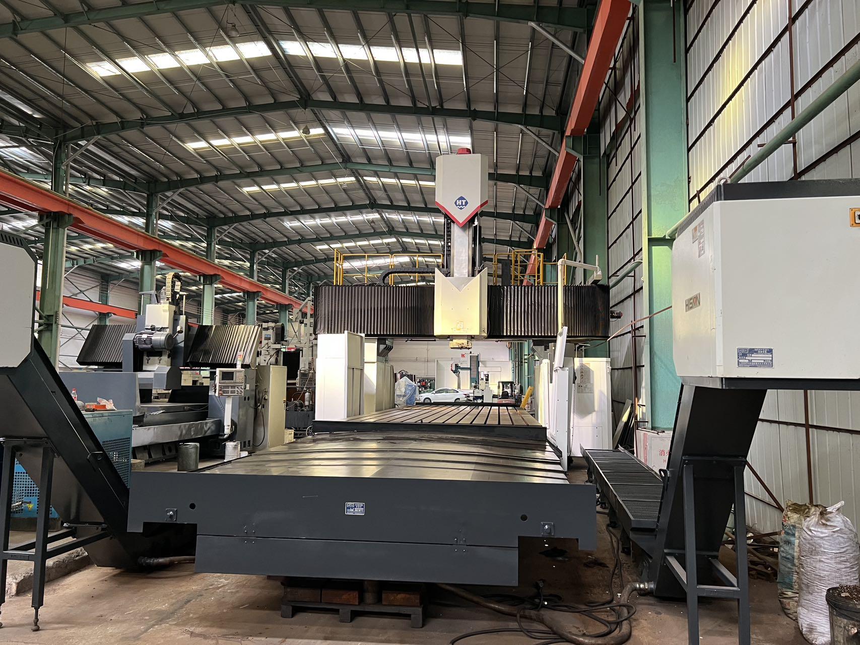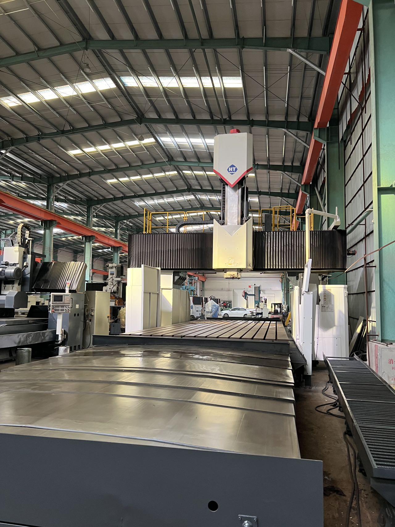 数控系统:发那科MF工作台尺寸:3000 * 8000 mm龙门宽:3650 mm龙门高:3650 mm三轴行程:8400 * 4300 * 1250 mm方滑枕是:450 * 450 mm配置:一个全自动直角铣头双龙头排屑机