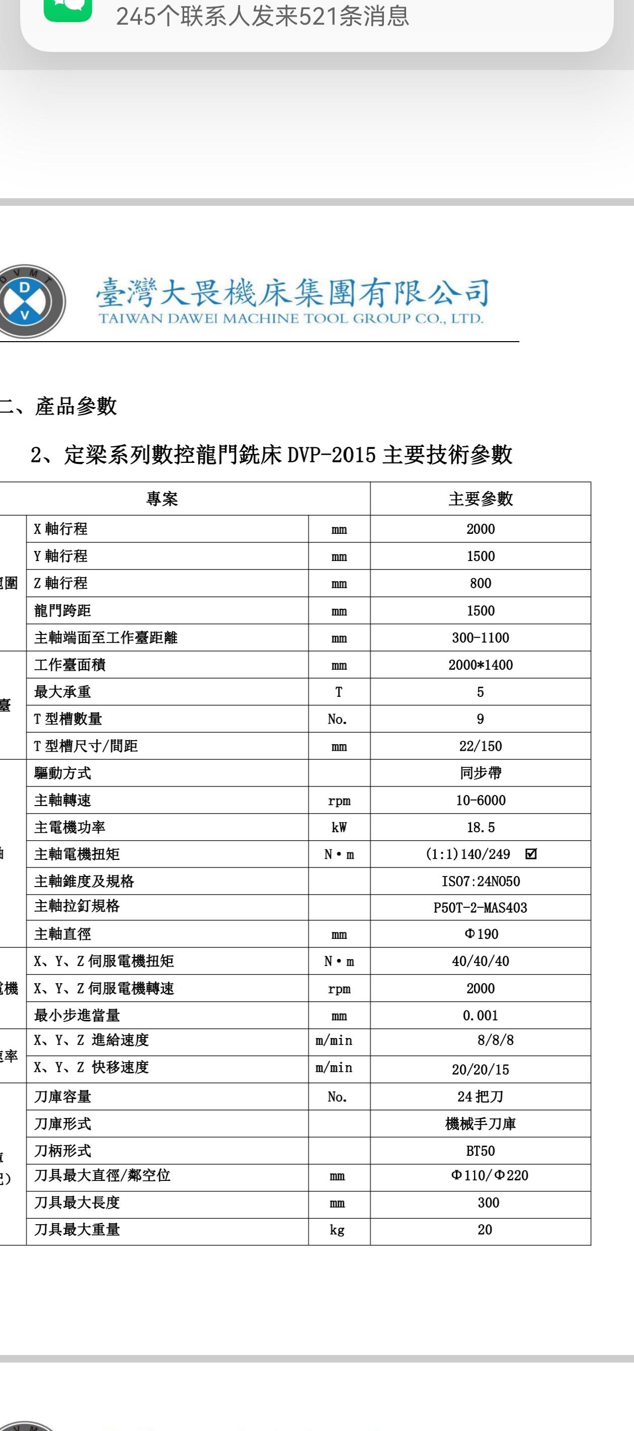 数控系统:发那科 MF Plus工作台尺寸: 2000 × 1400 mm三轴行程:2000 × 1500 × 800 mm龙门宽度: 1500 mm龙门高度: 1250 mm主轴:BT50主轴转速:6000 转/分钟刀库容量:24,机械刀库工作台到主轴鼻端距离: 1100 mm配置:排屑系统: 双螺旋 + 龙头链式