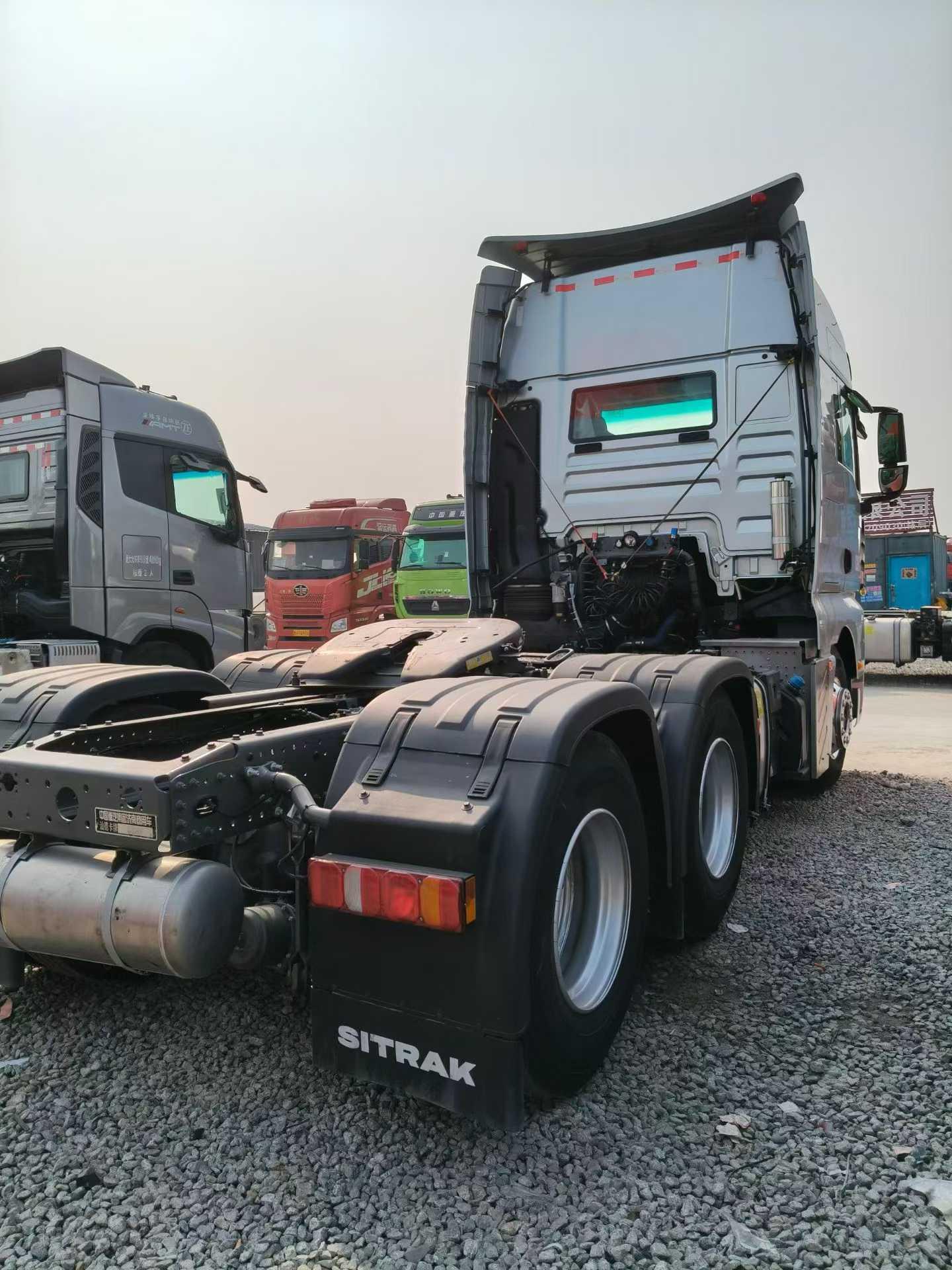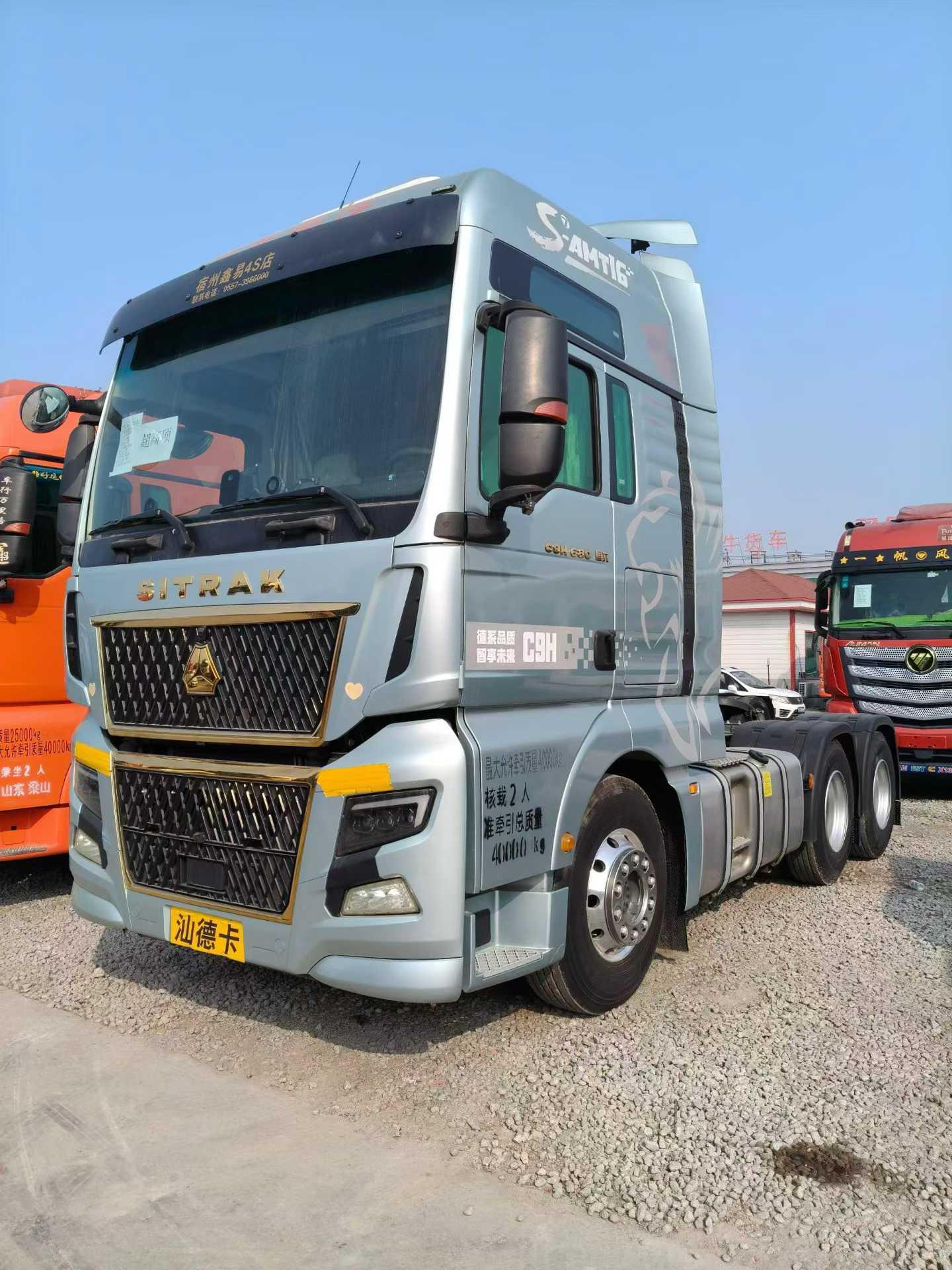 • 品牌:中国重汽·汕德卡(SITRAK)• 车型:C9H 超高顶 6×4 牵引车• 自重:约 8.3 吨• 外形尺寸:约 7170×2496×3980 mm• 轴距:3300 mm• 额定乘员:2–3 人 动力系统• 发动机:潍柴WP15T(680马力)◦ 排量: 14.6L◦ 峰值扭矩:2600–3200 N·m(900–1400 转爆发)◦ 排放标准:国六• 变速箱:重汽第七代 S-AMT16 手自一体变速箱(或 ZF12TX2621 TD)◦ 标配液力缓速器,长下坡更安全• 驱动桥:曼技术 MCY12BGS 驱动桥,主减速比约 2.71