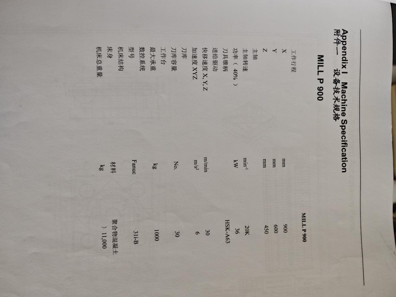 数控系统:发那科 31i B FS三轴行程:900 *600 * 600 mm工作台尺寸:1000 * 600 mm工作台承重:1000 kg主轴转速:20000 rpm刀柄接口:HSK-A63最大线路阻抗:0.79 ohm电压:3×400 VAC配置:Step-Tec 瑞士 主轴带原厂对刀仪“HEXAGON”