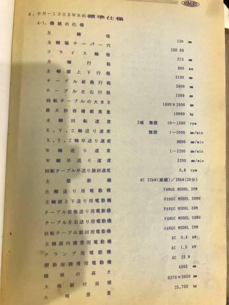 数控系统:发那科镗杠直径:130 mm铣轴直径:215 mm主轴行程:900 mm三轴行程(X/Y/Z):2400 × 1500 × 2100 mm回转工作台尺寸:1800 × 2000 mm工作台承重:10 吨主轴转速:10–1500 rpm机床外形尺寸(长 × 宽 × 高):6370 × 5650 × 4995 mm机床重量:约 25.7 吨