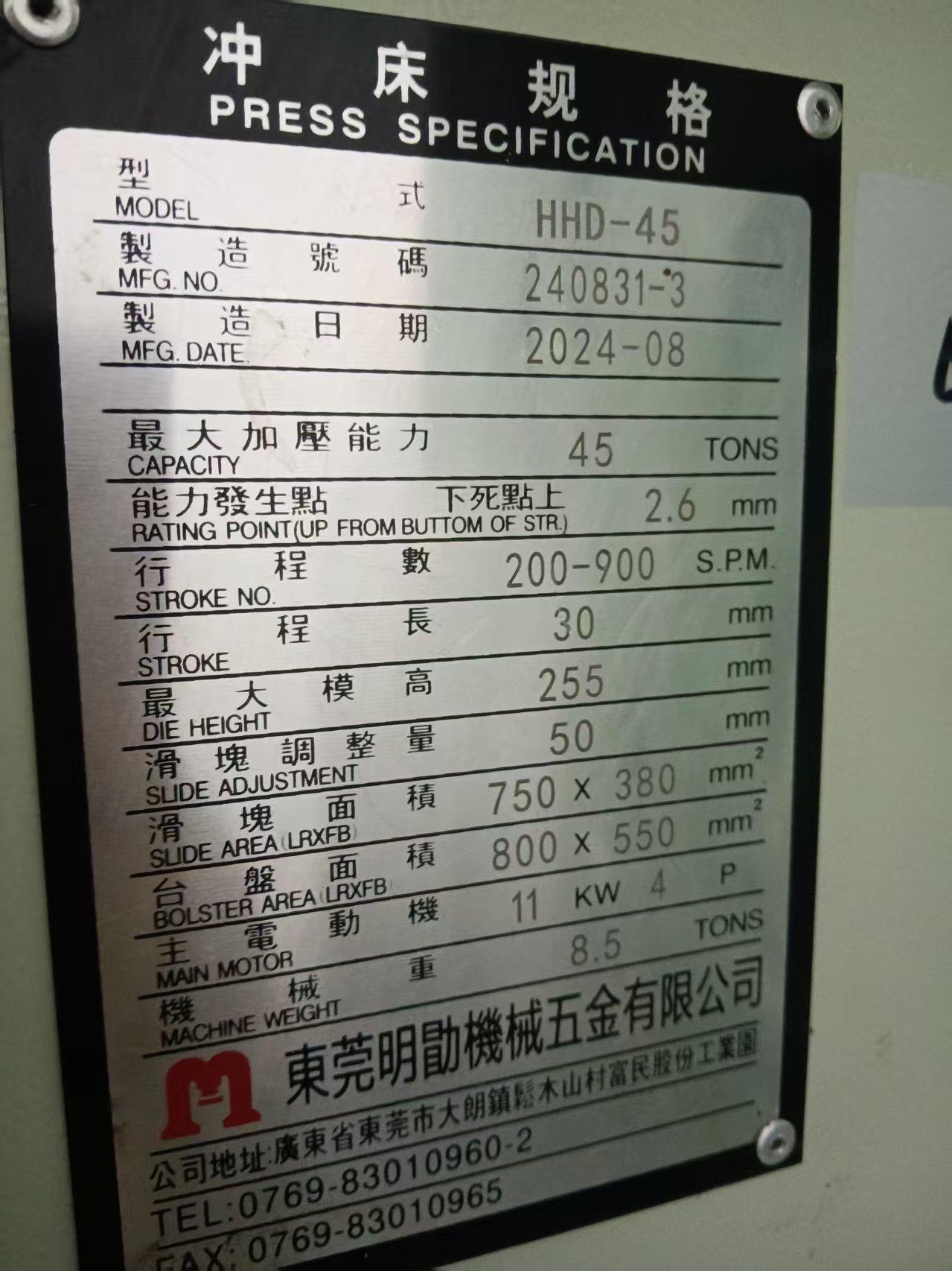 最大加压能力:45TON行程数:200-900spm行程长:30mm最大模高:255mm滑块调整量:50mm滑块尺寸:750x380mm台盘尺寸:800x550mm主电动机:11kW机械重:8.5TONS