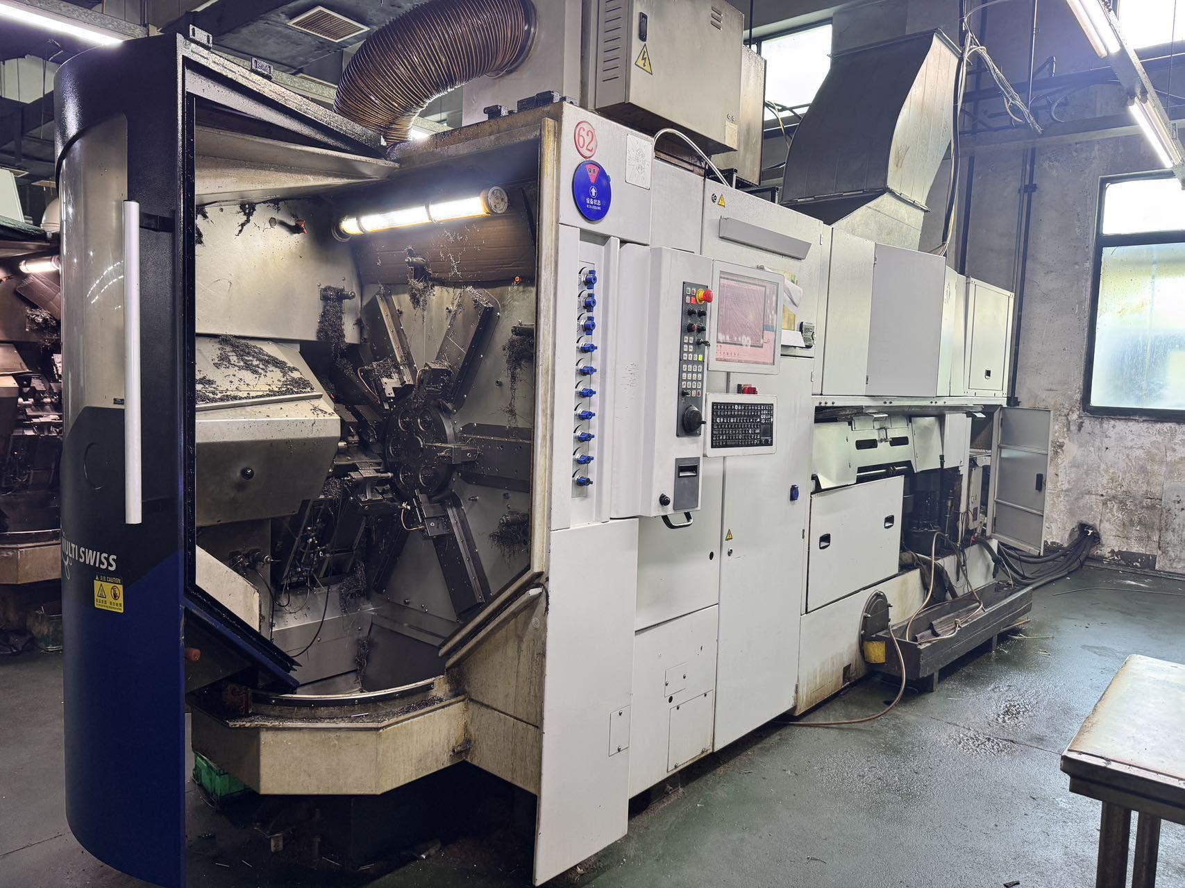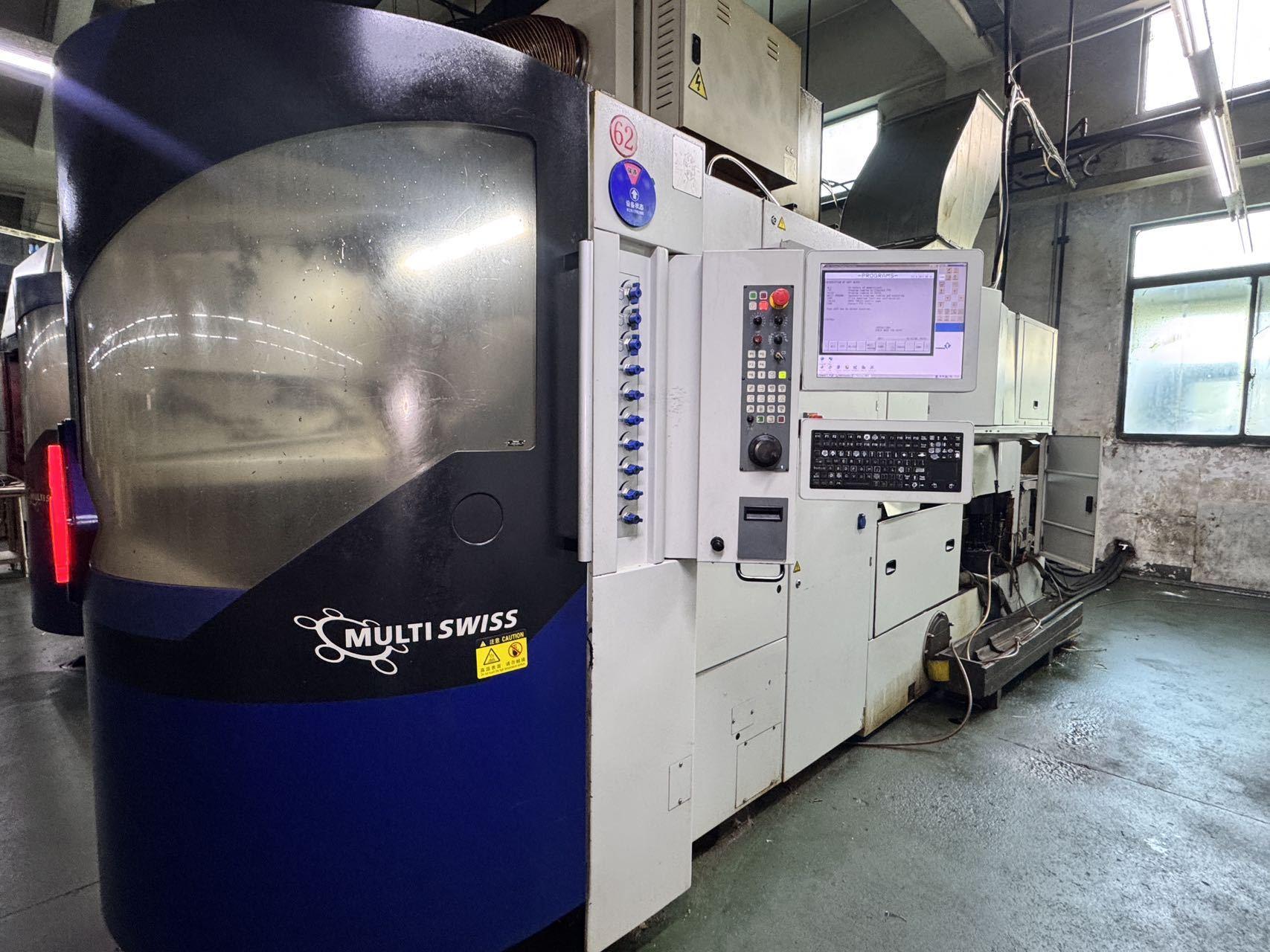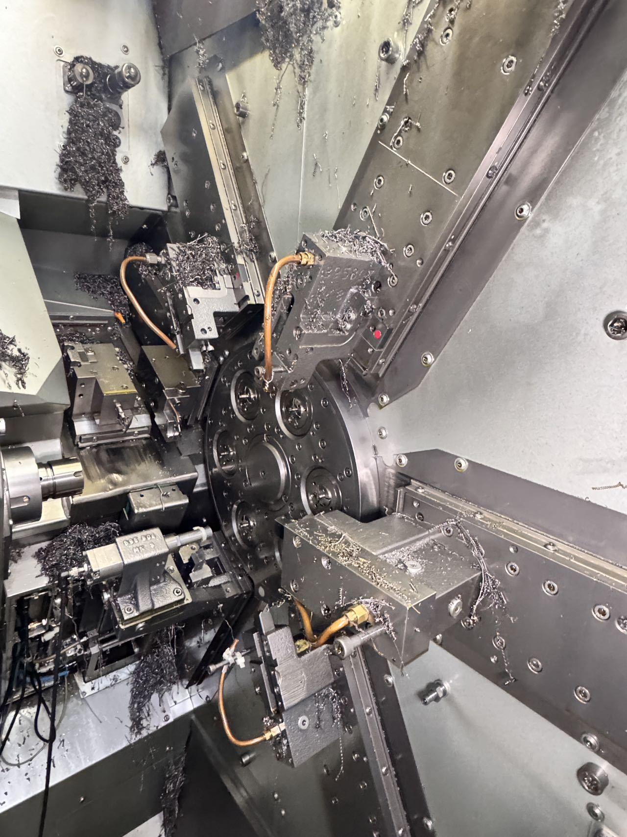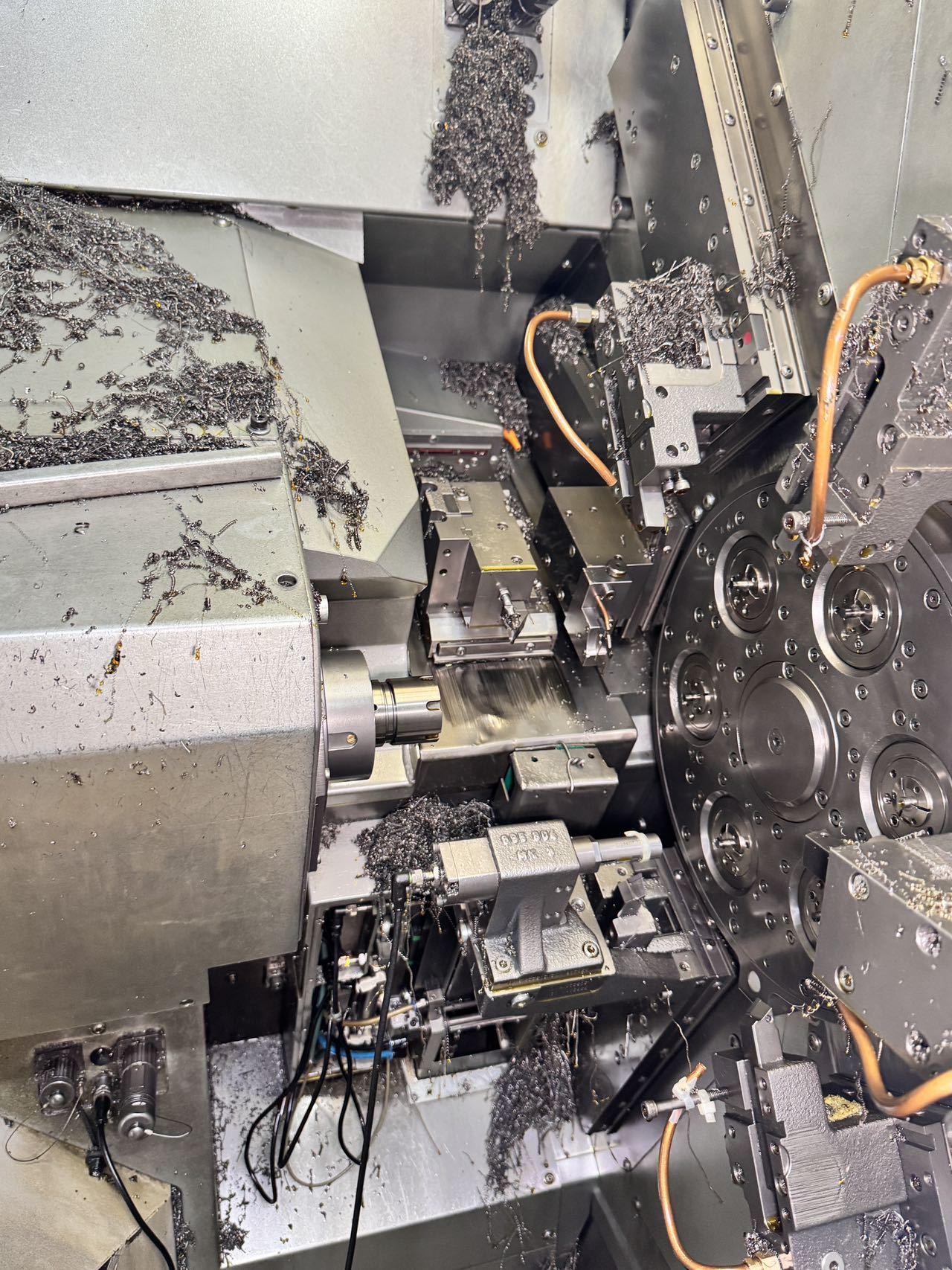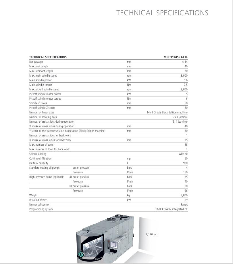 棒料通径:4–14 mm 最大加工长度:40 mm 最大残料长度:70 mm 主轴: 主轴最高转速:8,000 rpm 主轴功率:5.6 kW 主轴扭矩:7.5 Nm 副主轴: 最高转速:8,000 rpm 功率:5 kW 扭矩:6 Nm 轴配置: 直线轴:14 + 1(Y轴,Black Edition) 旋转轴:7 + 1(选配) 切削滑台:5 + 1 背面加:工滑台:1 主轴 Z 轴行程:50 mm 副主轴 Z 轴行程:150 mm 切削滑台 X 轴行程:40 mm 切削滑台 Y 轴行程:30 mm 背面加工 X 轴行程:75 mm 刀具: 最大刀位数:18 背面加工刀位:2 冷却与油路 主轴冷却:油冷 切削液过滤精度:50 μm 油箱容量:900 L 泵系统: 标准泵:4 bar / 150 L/min 高压泵(选配): 35 bar / 40 L/min 80 bar / 26 L/min 其他: 整机重量:7,000 kg 总功率:59 kW